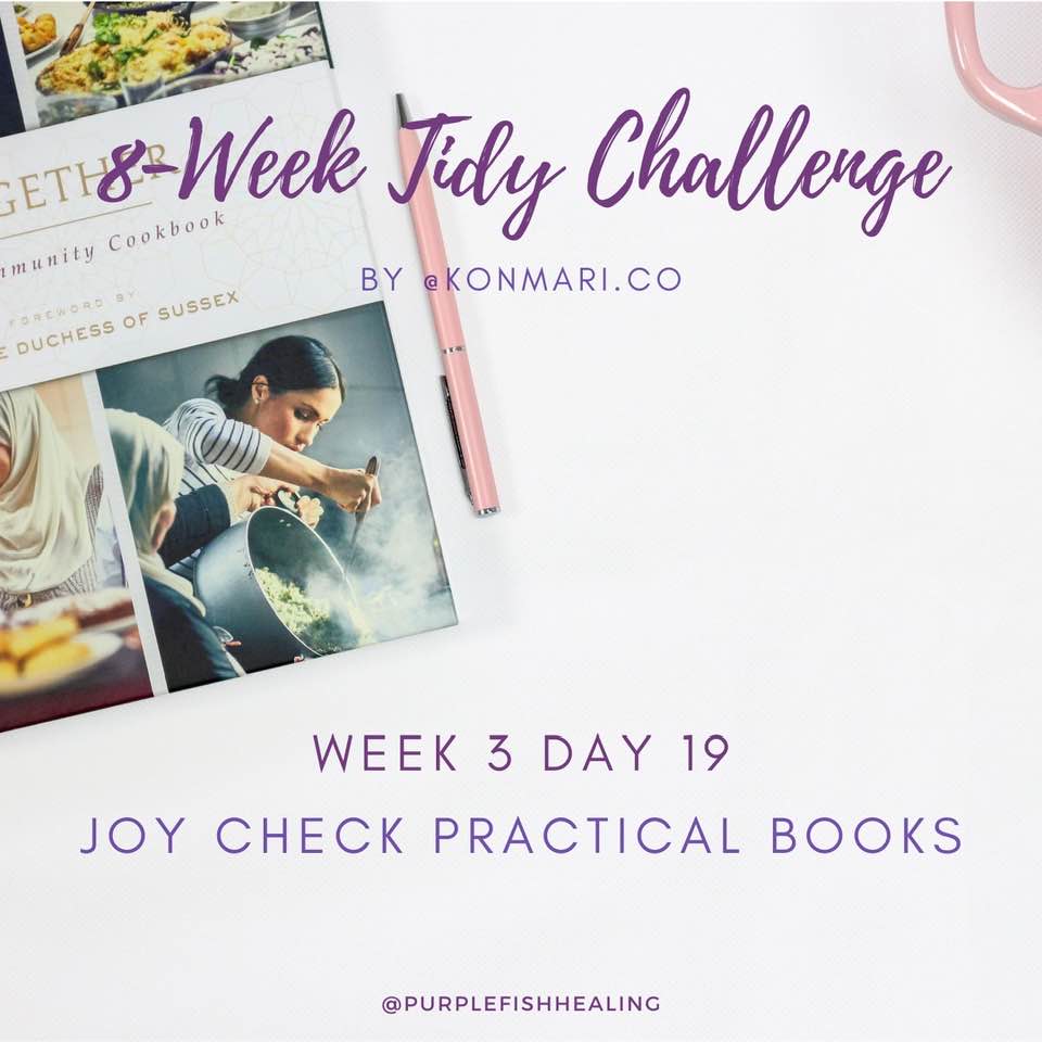 After the general books, start joy checking practical books with a specific purpose or function like reference books and cookbooks.